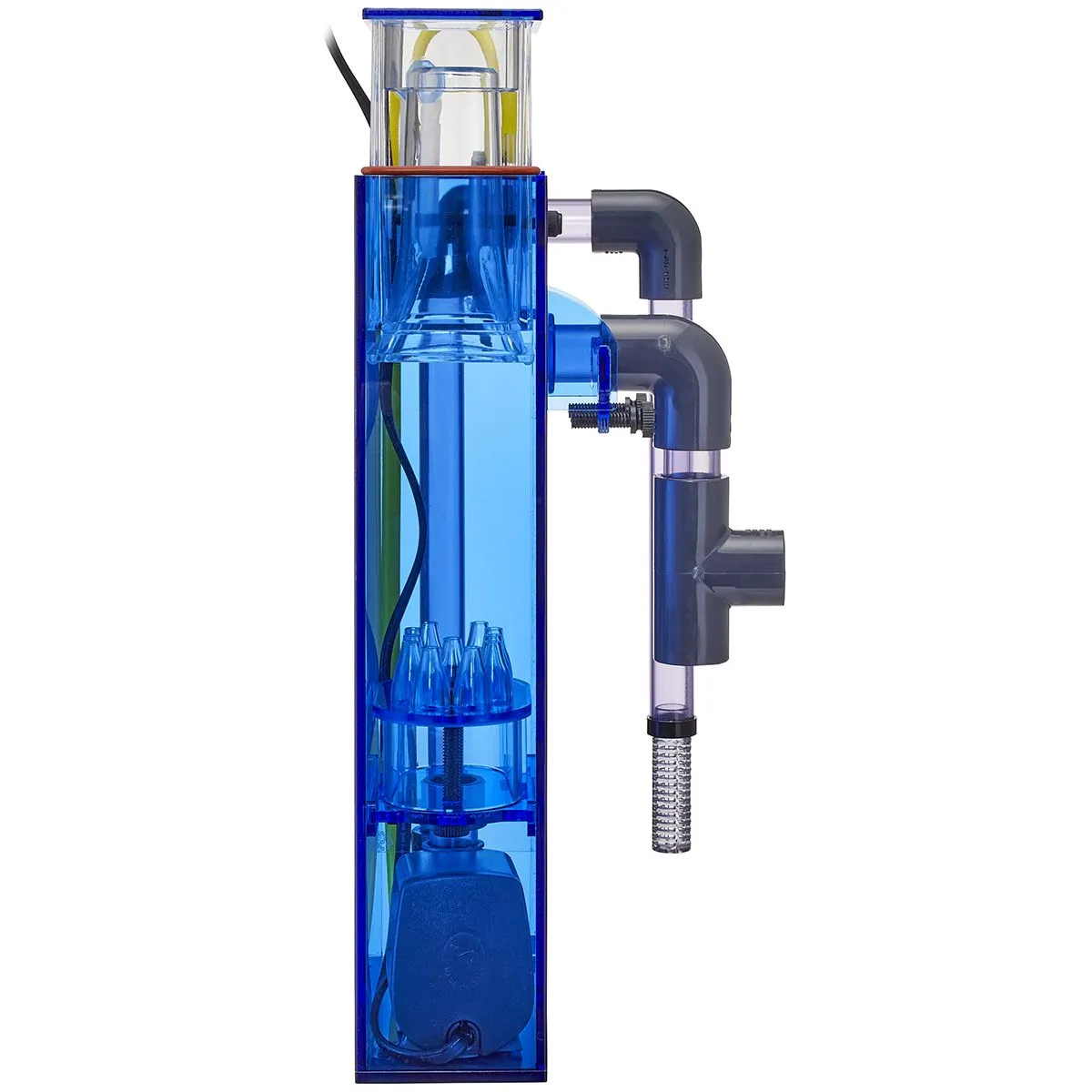 Slide the collection cup up for drier, more concentrated skimmate during normal operation, or down for wetter skimming when bioload spikes — for example after a large feeding or when adding new livestock. A drain fitting is included for reefers who prefer to plumb the cup to a separate waste reservoir rather than emptying it manually.
