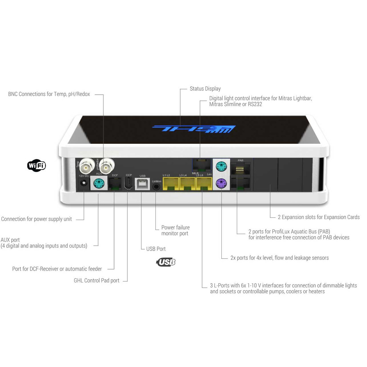 The ProfiLux 4e integrates natively with every GHL accessory: the KH Director for automated alkalinity monitoring, the Doser 2.1 for precision dosing, GHL Stream pumps, Expansion Cards, the Expansion Box 2, automatic fish feeders and more. The ProfiLux Aquatic Bus supports up to 100 meters of cable, making the system practical for large installations with equipment spread across different locations.