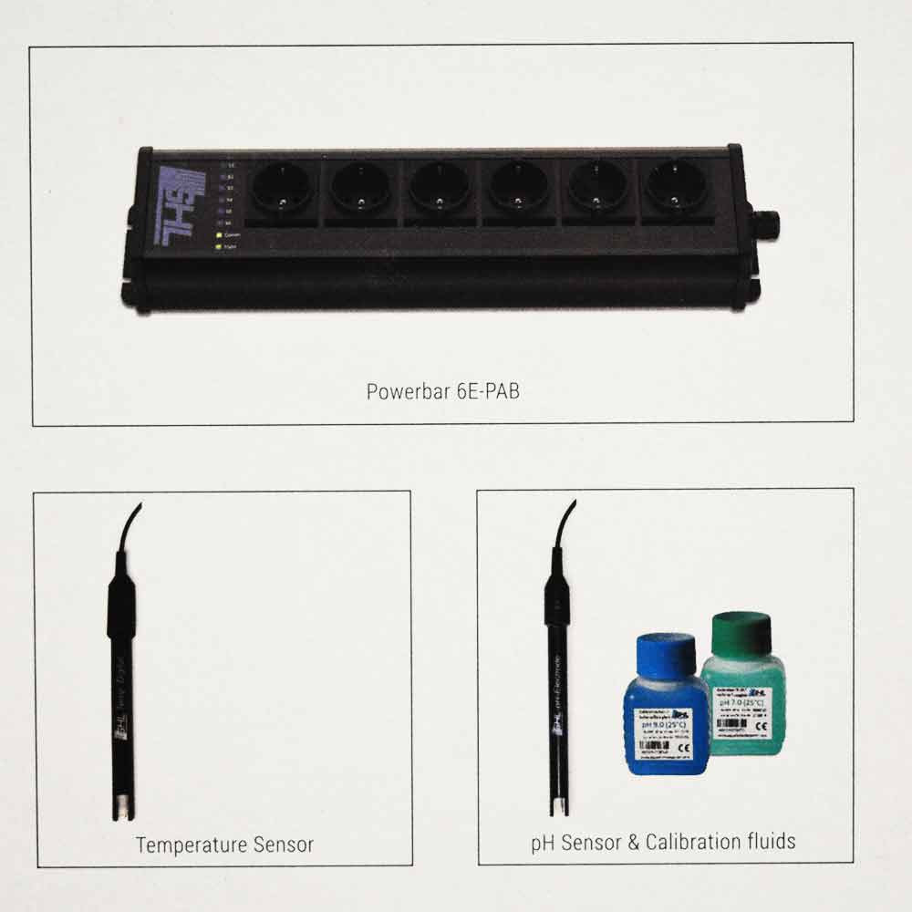 In the box: ProfiLux 4e controller with power supply, digital temperature sensor, pH electrode, pH 4 and pH 7 calibration fluids, Powerbar 6E, USB cable, PAB cable 2m