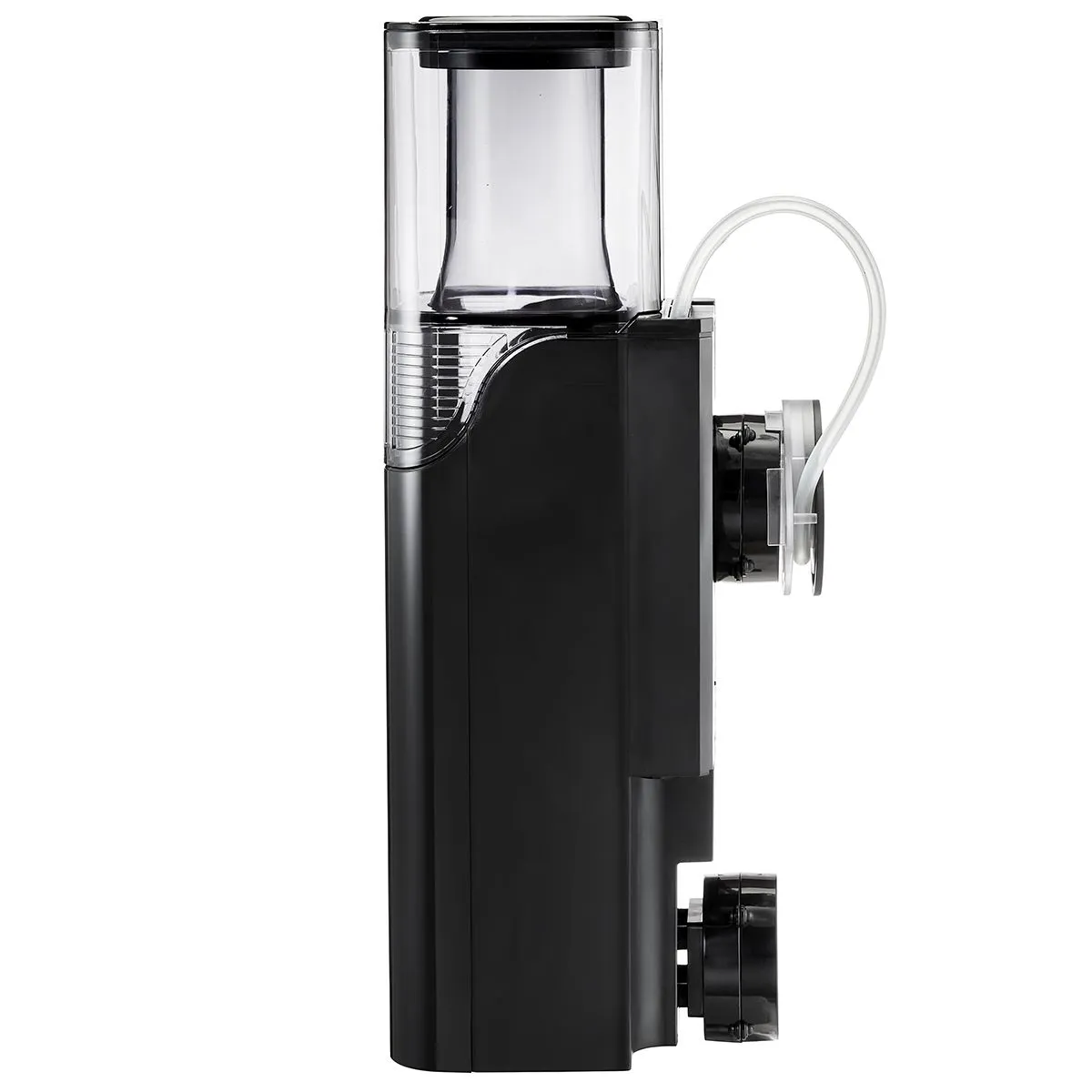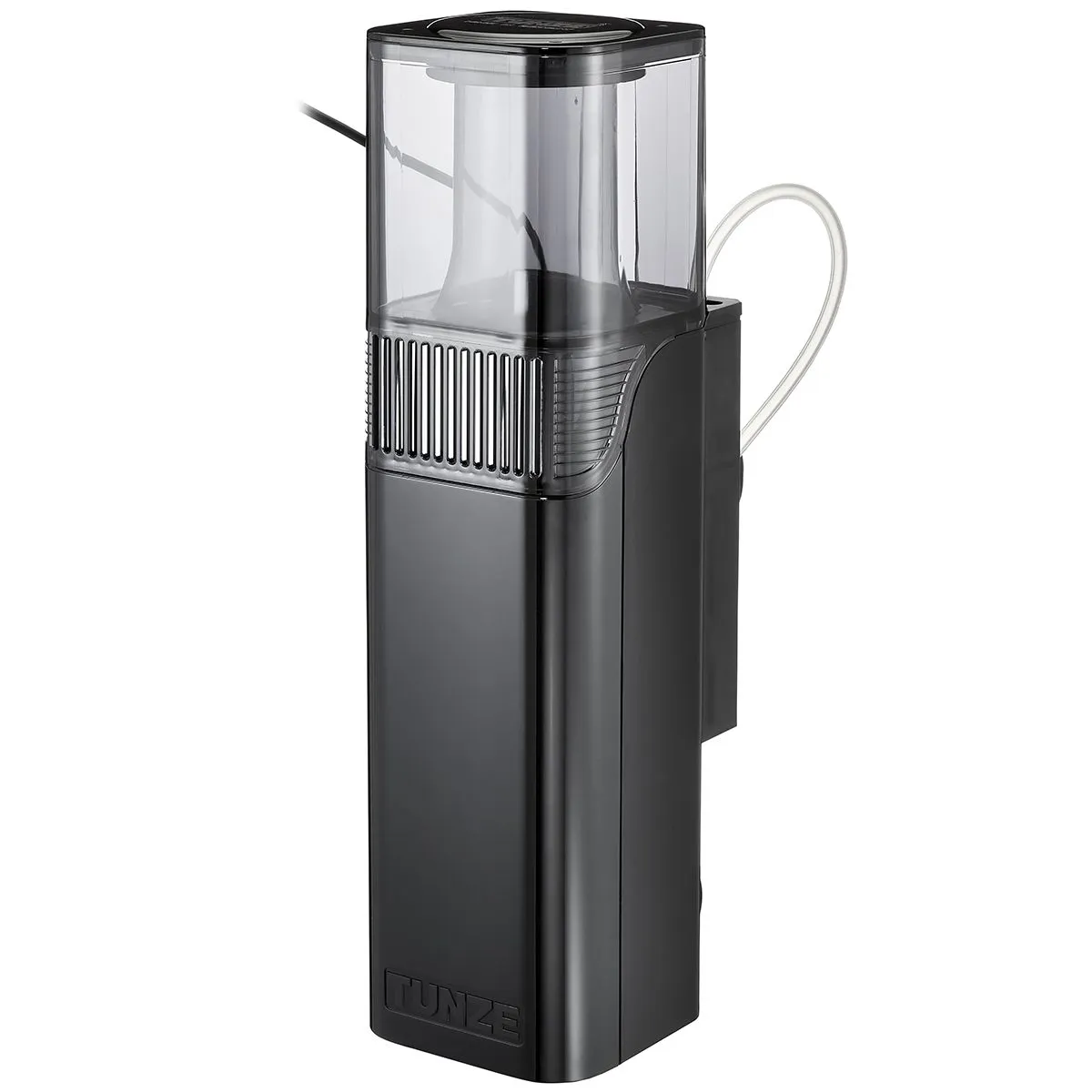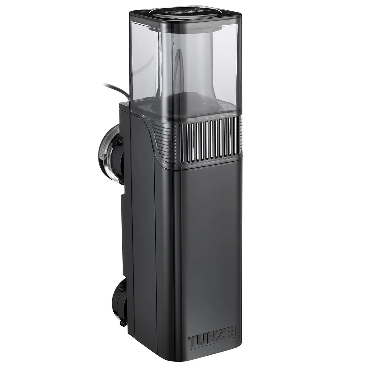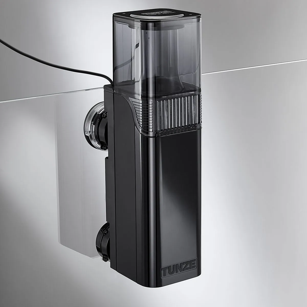 The HUB Edition replaces the previous AC motor with a safety extra-low voltage 12V DC system. The result is noticeably quieter operation, lower energy consumption (just 9W), and full speed control via the included Tunze Controller 7090. Silicone buffers on the skimmer body prevent vibration transfer to the glass, keeping the unit virtually silent in operation.